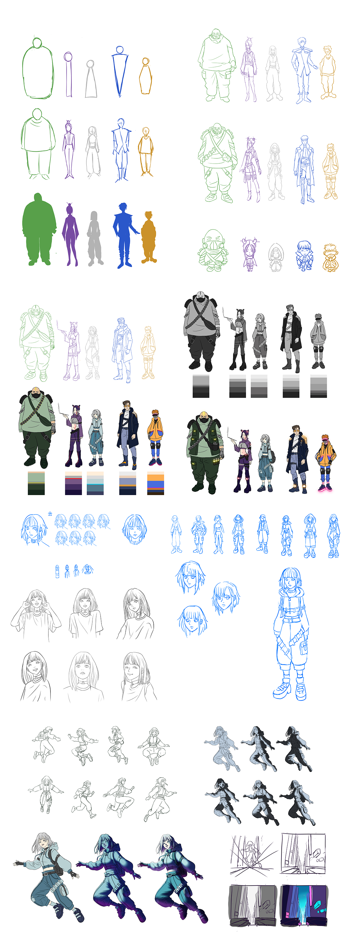 Designing a comprehensive visual identity for a sci-fi protagonist. This project showcases a full production pipeline: from initial silhouette analysis and facial expression studies to dynamic posing and final integration into a high-tech environment.