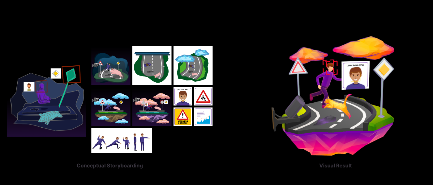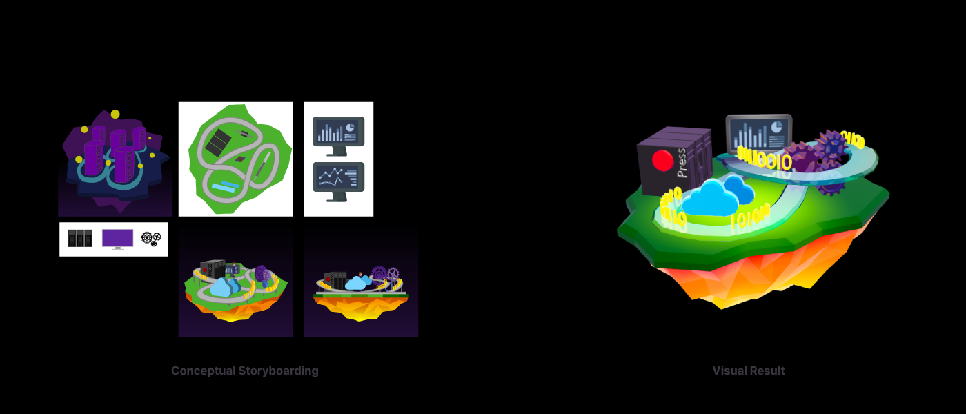 Conceptualizing 6 interactive 3D scenes for high-tech domains (NLP, Image Processing, Infrastructure etc), designed to engage users and encourage exploration while they navigate through technical service descriptions. Developed the visual language, interaction logic, and detailed storyboards, supervising the final production in Spline.