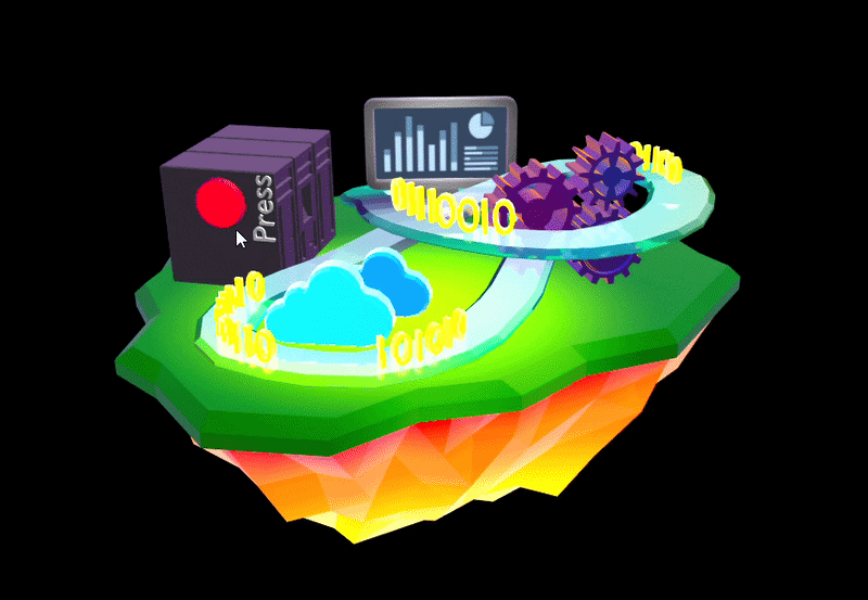 Logic: User-Triggered Event. Manual "Press" activation starts a chain reaction: gear rotation, dynamic graph updates, and data packet (0/1) levitation.