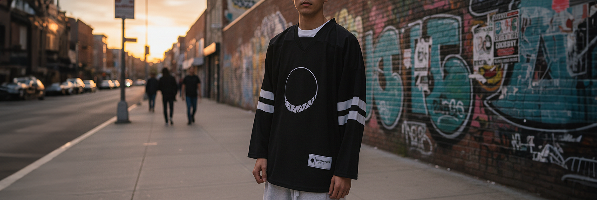 New brand WHAThePUCK, combining streetwear and hockey uniforms.